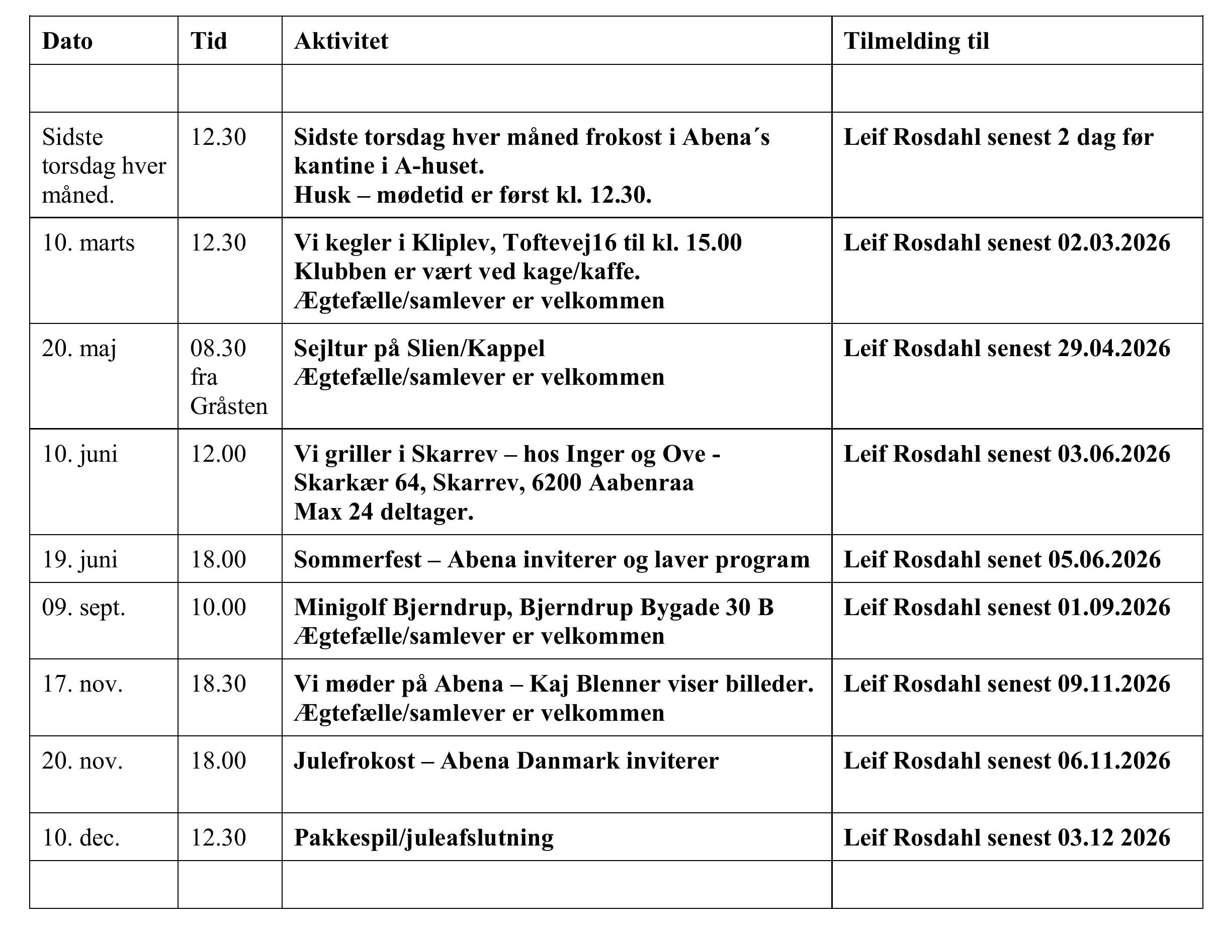 Aktivitetsplan 2026 Tilmelding til formanden kan ske på telefon 5135 1494 eller mail: rosdahl@mail.tele.dk